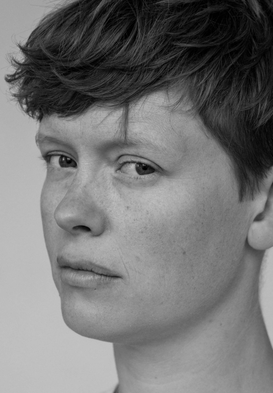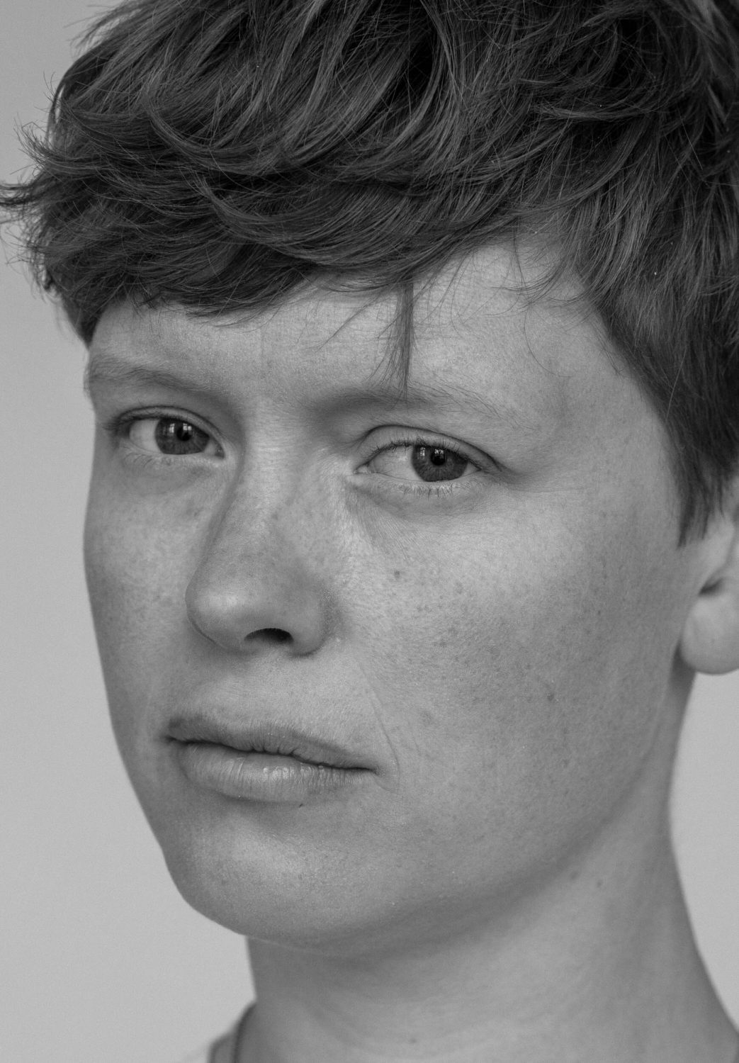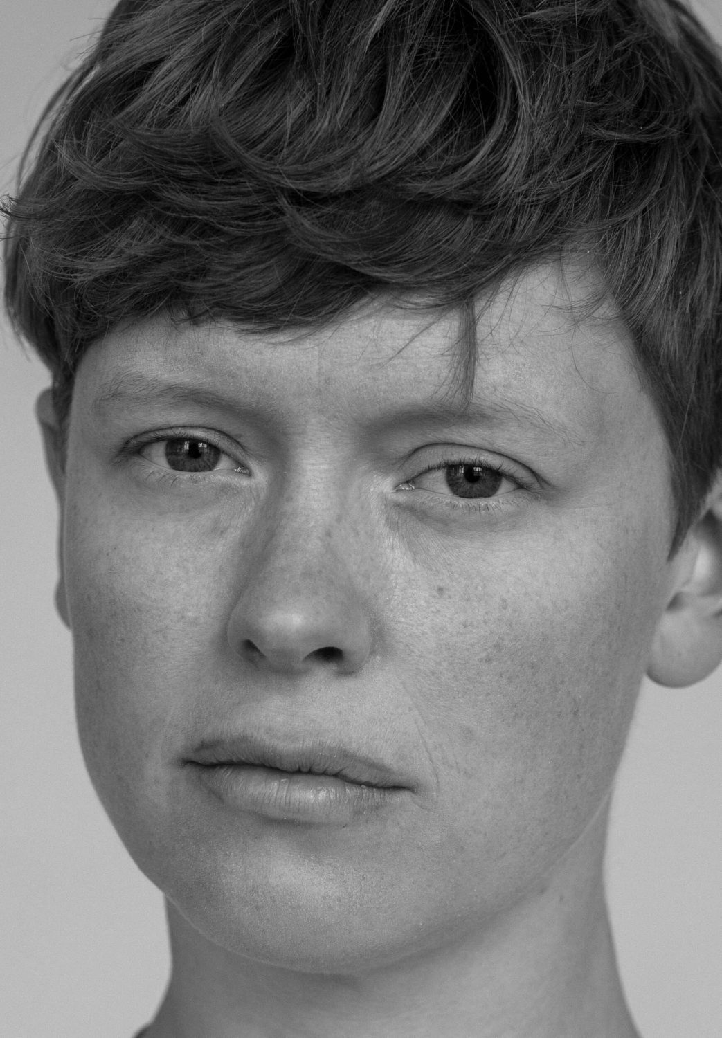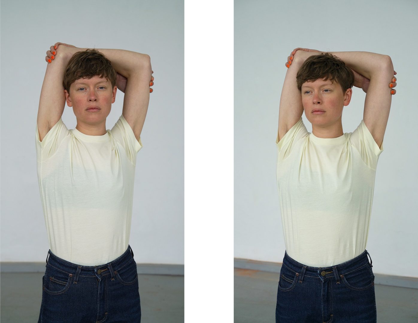 Astrid (Doppel), 2022 2-Kanal-Video, zwei 55 Zoll Monitore, 6:53 min, Loop, ohne Sound Astrid (Betrachtung), 2024 Das 2-Kanal-Video-Porträt »Astrid (Doppel)« bewegt sich an der Schnittstelle von Fotografie und Bewegtbild und stellt den Blick und insbesondere die Pose in den Fokus. Die Pose ist wie eine »vor-fotografische Fotografie« (Kaja Silverman): Das Subjekt versucht mit der Pose Handlungsmacht über den Prozess des Zum-Bild-Werdens zu erlangen, indem es versucht, das Bild vorwegzunehmen. In »Astrid (Betrachtung)« begegnen wir in fünf Bildern Astrids Blick in Nahaufnahme. »Im Porträt entwirft, entzieht und entscheidet sich vor unseren Augen ganz sichtbar unsere Möglichkeit, präsent zu sein.« (Jean-Luc Nancy: »Das andere Porträt«)