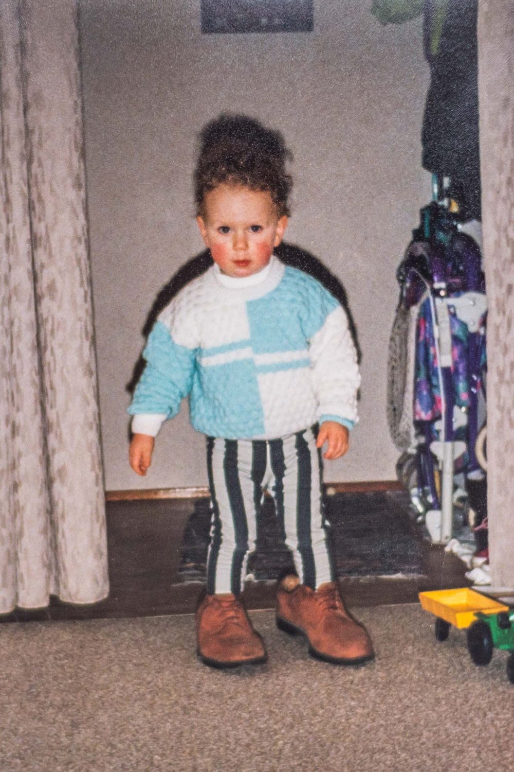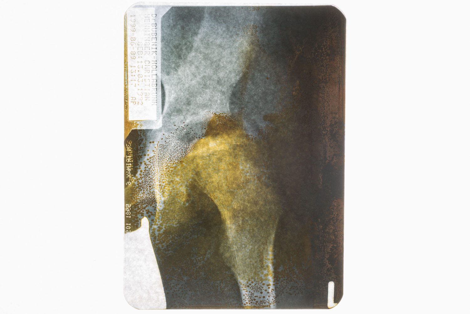 Im Alter von 5 Jahren bekam ich die Diagnose Morbus Perthes. Dabei stirbt aufgrund einer Durchblutungsstörung Knochengewebe im Hüftkopf ab: Nekrose. Themen, die mich seit meiner Kindheit prägen, wie die Instabilität meines Körpers, der Schiefstand, Knochenfragilität oder der Wunsch nach einem neuen Bein, werden in diesem Projekt visualisiert. Das Durchsehen der Bilder aus dem Familienarchiv führte mich Bild für Bild zurück in mein kindliches, durch die Krankheit auch seelisch instabiles Ich. Teilweise wurden mir diese genetischen Merkmale schon in (großen) Kinderschuhen mitgegeben. Bis zu dem Zeitpunkt, ab dem ich meine eigenen (Schuh-) Mutationen tragen musste. Vom Ursprung, zu den Auswirkungen, bis hin zu den Therapiemaßnahmen, zeigt »NECROSiS« anhand von Fotoscans, selbstaufgenommenen und modifizierten Bildern diesen Aufbruch zu mir Selbst. Durch diese Aufarbeitung gelang es mir nicht nur, neue visuelle Techniken zu erlernen, sondern behutsam und mutig durch die Linse auf mich zurück zu blicken.